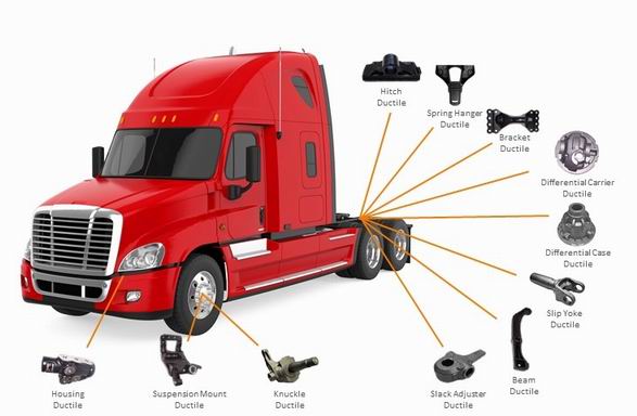 Gray cast iron and ductile iron casting components are widely used in engine, transmission and cultch, suspension, driveline and wheel end of a heavy truck.